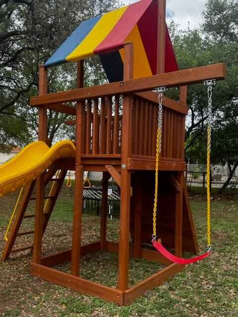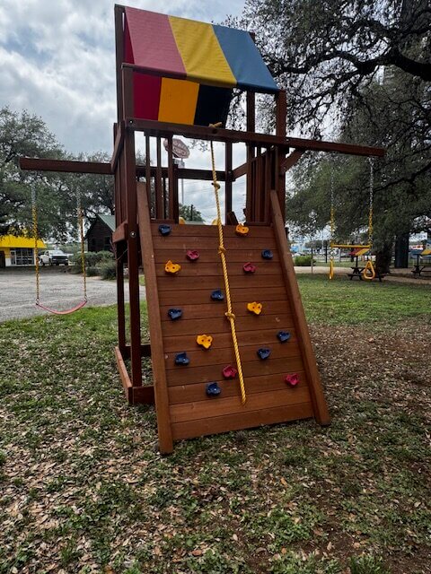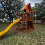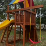 The Sunshine Clubhouse Popular 33B from Rainbow Play Systems is a versatile playset designed to deliver big backyard adventure with a classic clubhouse layout. Built with a 5′ deck height and a spacious 5′ x 5′ clubhouse, it provides plenty of room for imaginative play and active fun. Kids can climb up using the rock wall ladder, then race down the 10′ wave slide for an exciting ride back to the ground. The 2 swings includes, giving kids plenty of space to swing and enjoy active outdoor play. Finished with Rainbow’s colorful canopy and constructed from 100% premium cedar, the Sunshine Clubhouse Popular 33B is built for durability, safety, and years of backyard enjoyment.