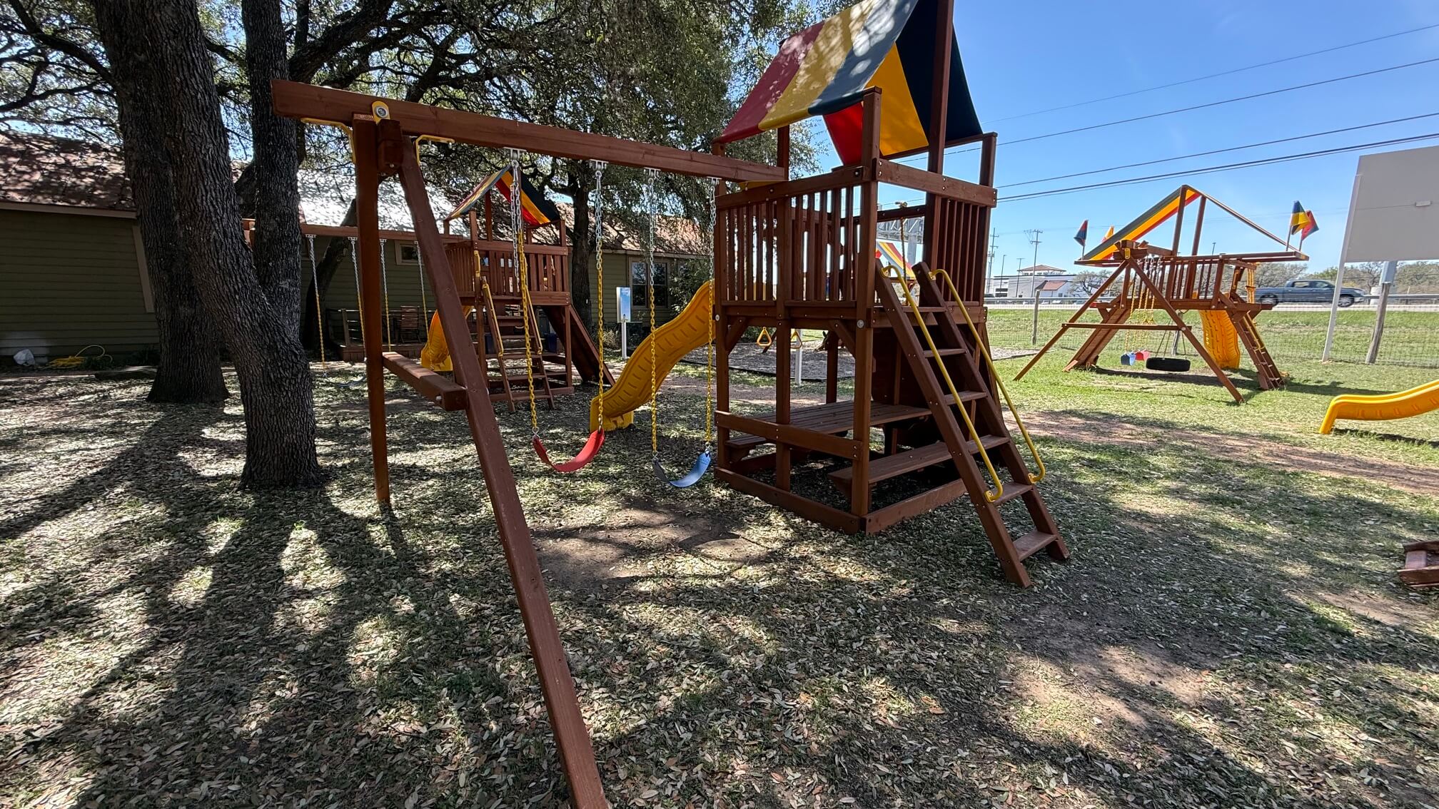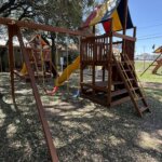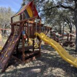 The Sunshine Clubhouse Popular 33B from Rainbow Play Systems is a bright and adventure-filled playset designed to bring hours of active fun to the backyard. Featuring a 5′ deck height and a spacious 5′ x 5′ clubhouse, it provides plenty of room for kids to climb, explore, and use their imagination. Children can reach the deck using the rock wall ladder or step/rung ladder, then enjoy an exciting ride down the 10′ wave slide. The 2-position swing beam includes two sling swings, giving kids a classic swinging experience that keeps them active and engaged. Topped with Rainbow’s colorful canopy and built from 100% premium cedar, the Sunshine Clubhouse Popular 33B is designed for durability, safety, and years of backyard play.