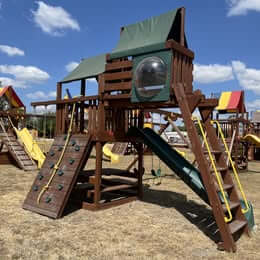 The 31H Circus Clubhouse Pkg IV from Rainbow Play Systems is designed for maximum backyard adventure in a compact footprint. With a deck height of 5′4″, a 4.8′ × 4.8′ clubhouse fort capped by dual canopies, and a thrilling 10′ Safety Scoop slide, it’s built for fun and durability. Climbers can choose a rock-wall ladder or step ladder, then swing on the 3-position swing beam (with 2 sling swings and commercial-grade hangers). Under the deck you’ll find generous 6′ of headroom, while the swing beam reaches 8.25′ high for ample motion. With overall dimensions of approx. 20′ × 17.5′ × 12.5′, this cedar-constructed set is engineered to last and built to thrill.