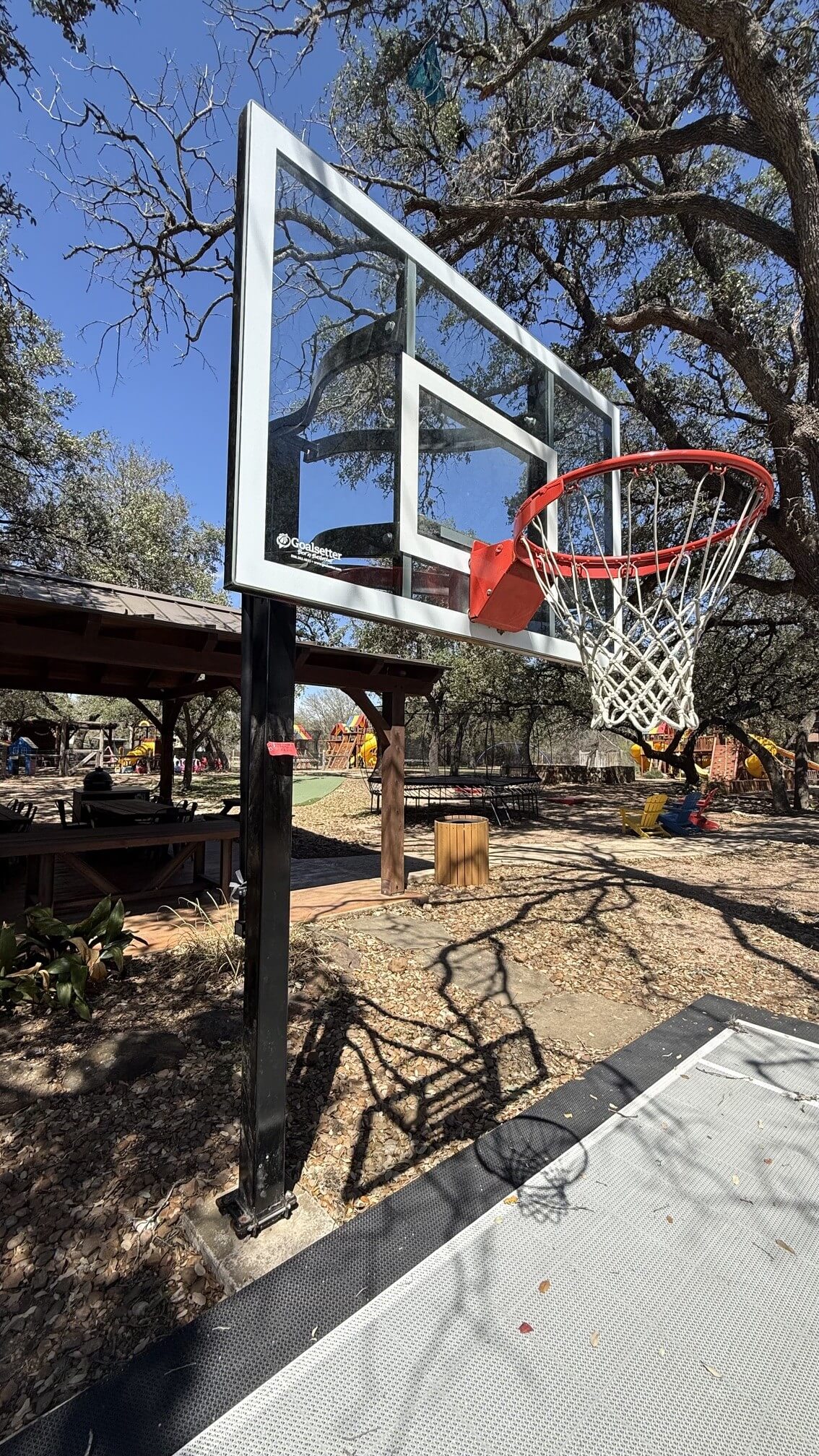 Goalsetter Basketball Goals are 100% made in the USA with a lifetime warranty. These goals are the last one you will ever need to buy, it separates from the anchor so if you move it moves. Glass backboard means no yellow, staring or fogging like acrylic – great driveway goal or small backyard slab goal.