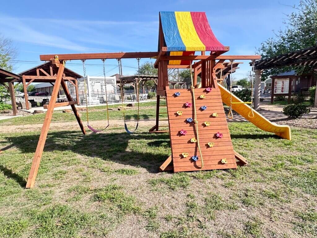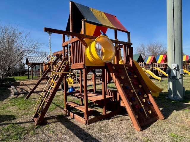 - 4 position swing beam -1 Baby bucket swing, 1-2chain tire swing, 1 trapeze/ball, 1 sling swing