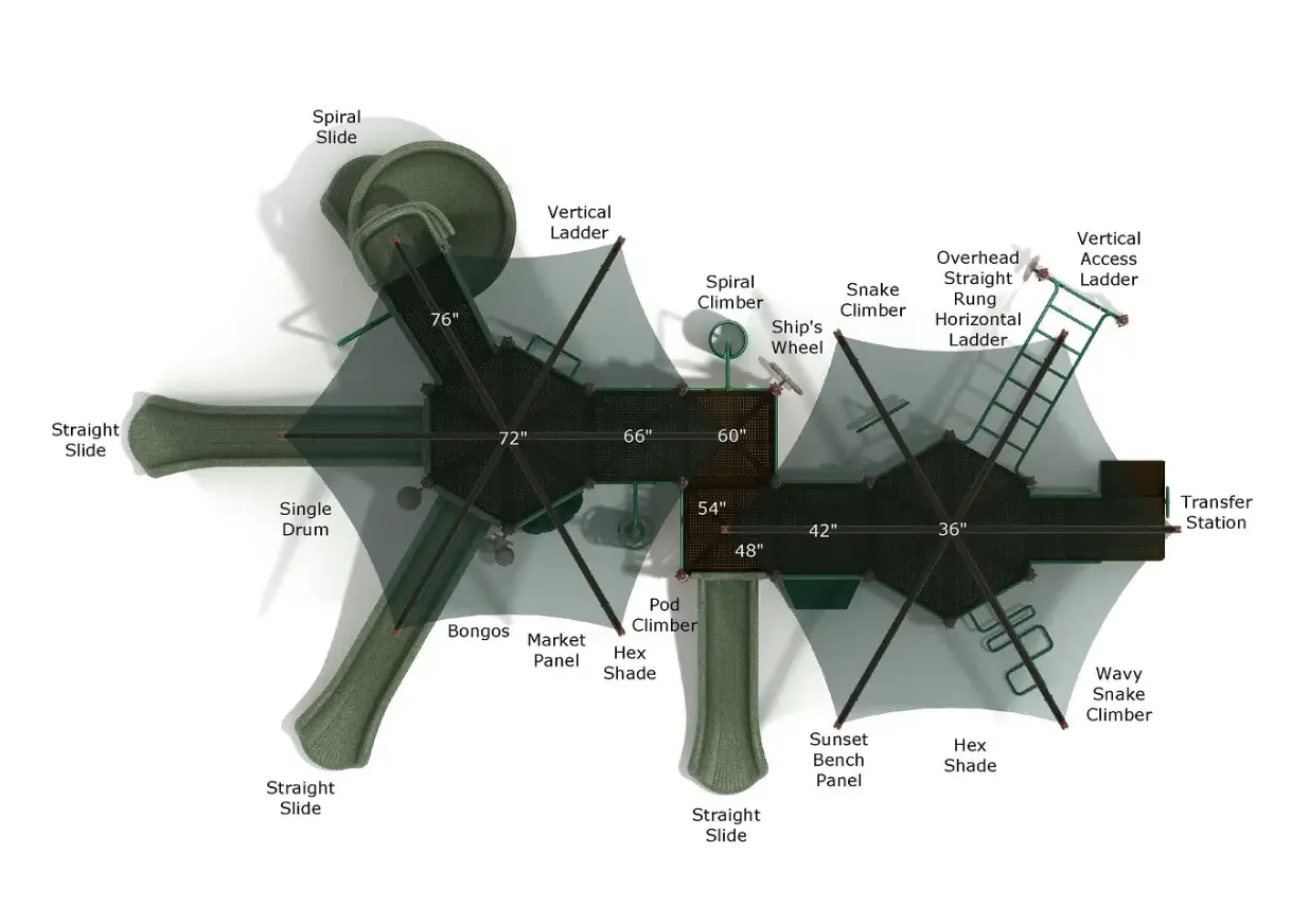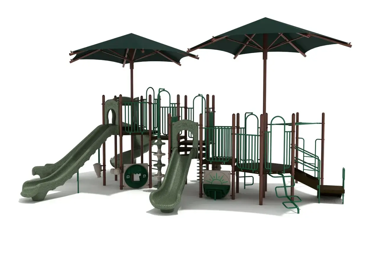 The real standout? Chandler lives up to its name with two large Hex Shades. These provide cool, refreshing shade, letting kids and caregivers enjoy the playground even on sunny days—an ideal choice for areas with dry or sunny climates.