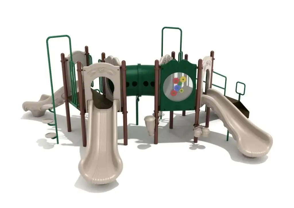 For kids who love to slide and play with their friends, there is no better play structure than the Grant playset. The most exciting feature of this play structure is, of course, the trio of 5-foot slides that children can ride down after climbing up to the hill’s summit via the Sea Creature Climber or accessible Transfer Station. The Wave Slide in the middle follows a straight path, but has a bumpy shape that slows kids down and adds to the fun. The Left and Right Turn Slides on either side of it are longer, and have an optional colorful striped pattern. For children who want a slightly gentler ride, there is also a 3-foot Double Slide. The fun continues at the bottom of the slides, where kids will find a Store Panel that is a perfect setting for them to play out imaginary games and scenarios with friends. For even more creative outlets, there is a set of Bongos where they can practice making rhythms, and a Ship’s Wheel that puts them at the helm of their own imaginary vessel.